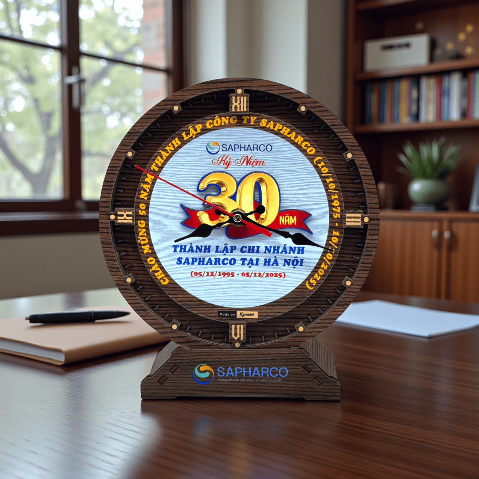 Ba mươi năm – một hành trình không quá dài nhưng đủ để viết nên những trang sử đầy tự hào. Để đánh dấu cột mốc 30 năm thành lập Sapharco Chi nhánh Hà Nội (05/12/1995 – 05/12/2025), Kymviet tự hào được lựa chọn là đơn vị thiết kế và sản xuất độc quyền sản phẩm quà tặng doanh nghiệp đầy ý nghĩa: Chiếc đồng hồ gỗ Sapharco.
