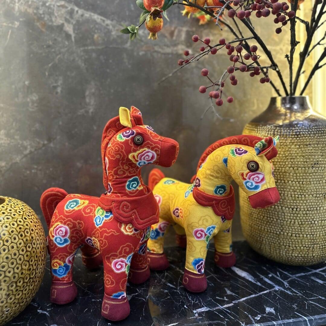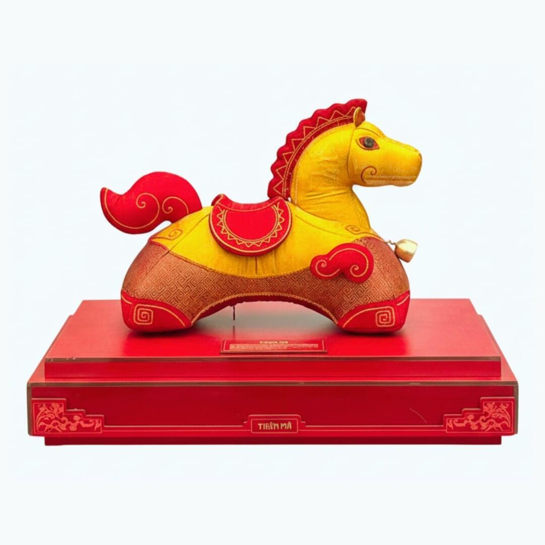 Điểm nhấn: Hình ảnh chú ngựa vải màu vàng và đỏ rực rỡ, uy dũng, được đặt trên bệ đỡ màu đỏ thắm. Đây là lời chúc về sự nghiệp "thuận buồm xuôi gió", công danh thăng tiến.